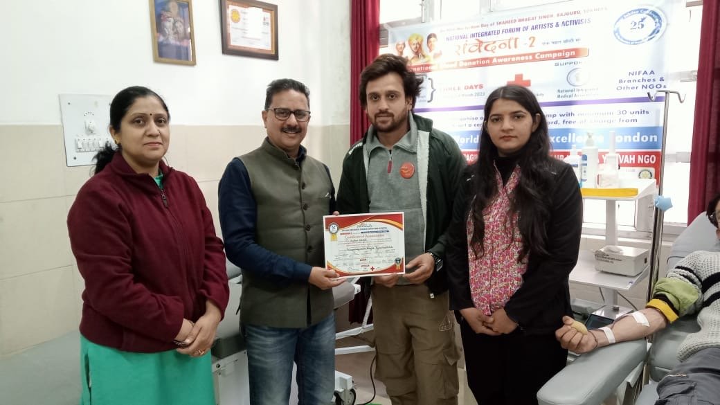 40 लोगों ने किया रक्तदान , नेशनल इंटीग्रेटेड फॉर्म ऑफ आर्टिस्ट एंड एक्टिविस्ट बैनर तले संवेदना – 2 के अंतर्गत रक्तदान शिविर किया आयोजित