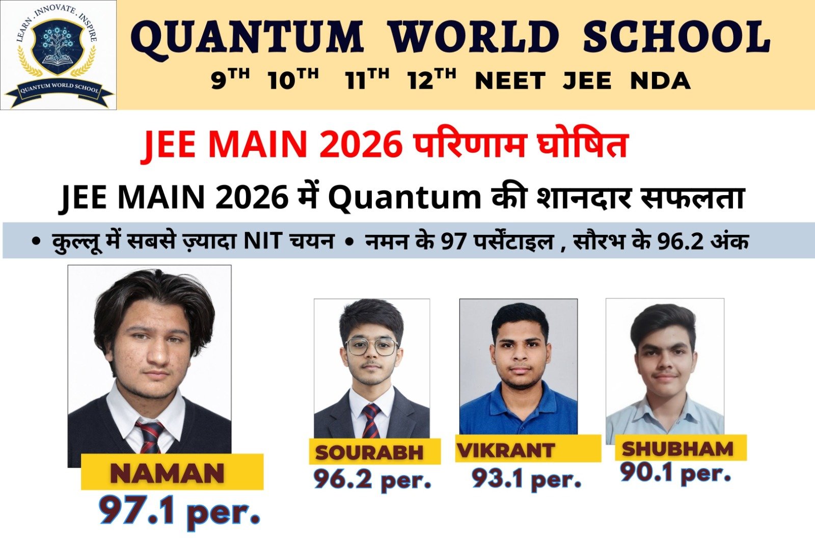 JEE 2026 परिणाम घोषित: QUANTUM ACADEMY मोहल के 4 छात्रों ने 90 पर्सेंटाइल से ऊपर हासिल कर रचा सफलता का इतिहास।