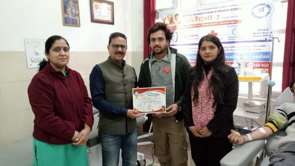 40 लोगों ने किया रक्तदान , नेशनल इंटीग्रेटेड फॉर्म ऑफ आर्टिस्ट एंड एक्टिविस्ट बैनर तले संवेदना - 2 के अंतर्गत...