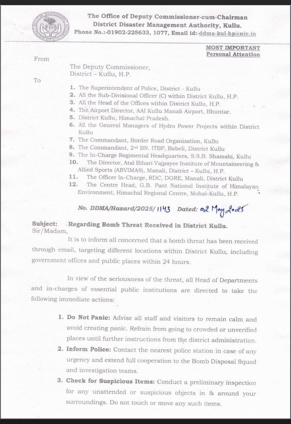 अब कुल्लू को भी आई 24 घण्टे में बम से उड़ाने की धमकी,प्रशासन अलर्ट। देसी चैनल कुल्लू। अब कुल्लू को...